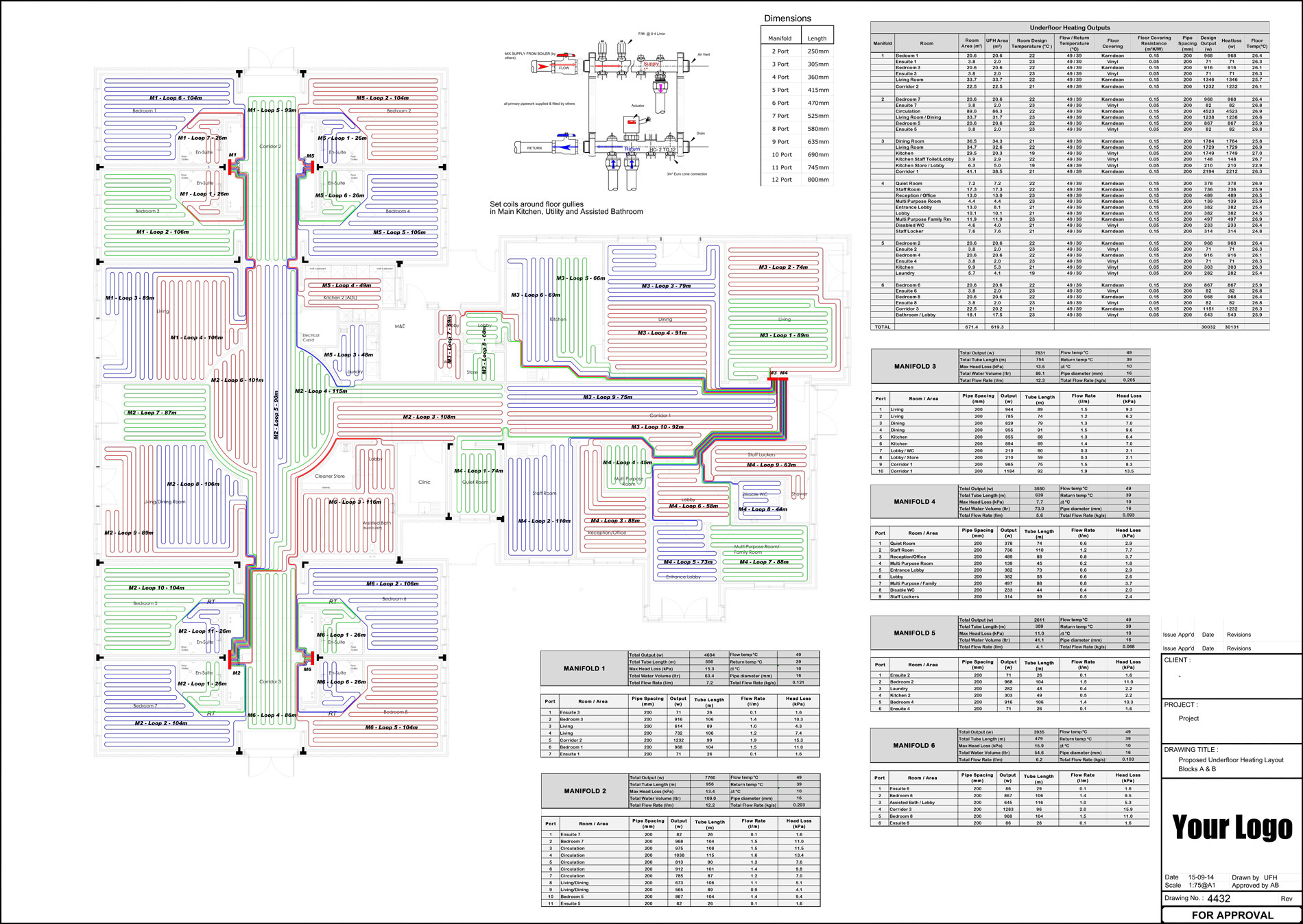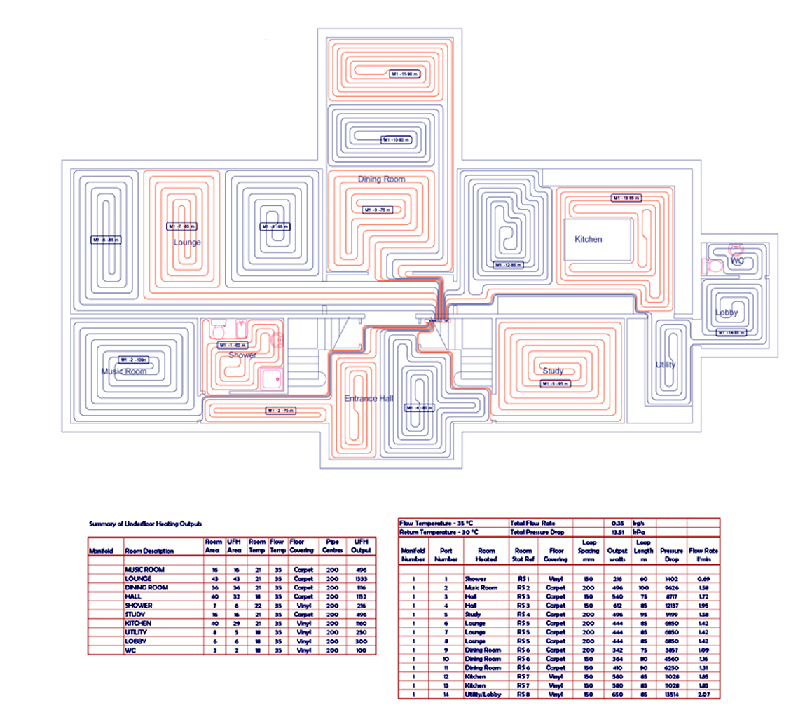 We can offer tube layouts only or full designs, including room by room heat loss calculations and outputs, tube lengths, water volumes, kPa calculations and flow rates depending on your requirements.